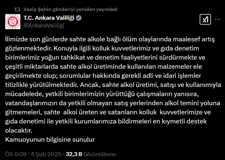 Ankara Valisi Vasip Şahin, il genelinde son zamanlarda 33 kişinin sahte alkollü içki sebebiyle hayatını kaybettiğini ve 20 kişinin hastanede tedavi altında olduğunu açıkladı.