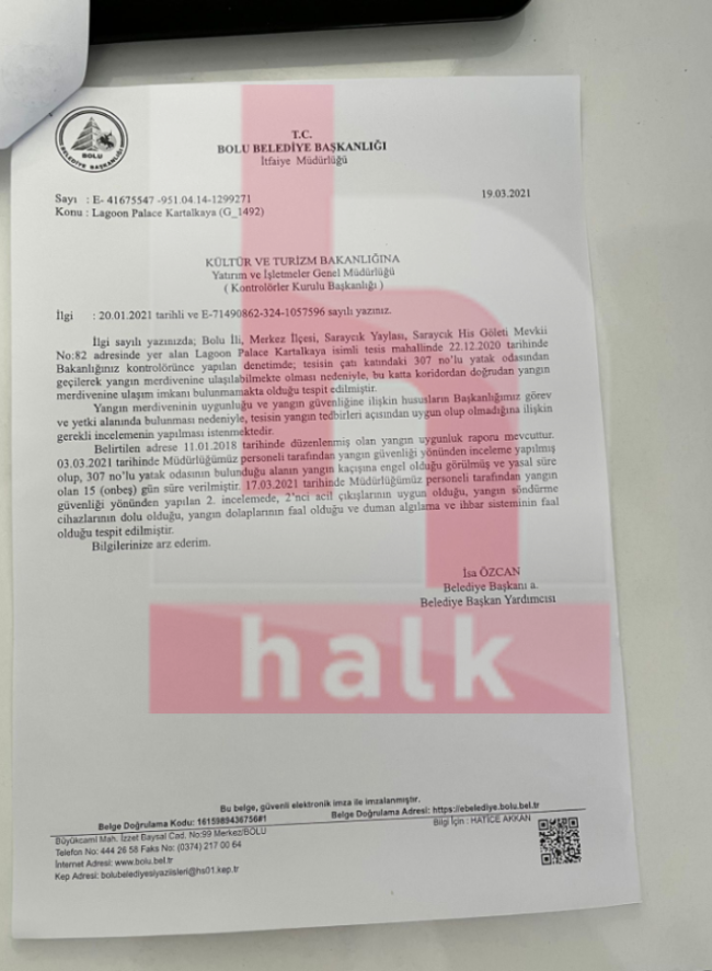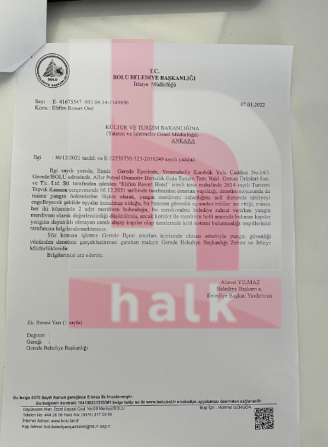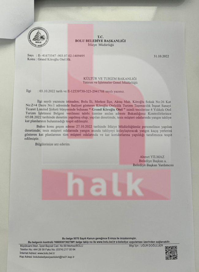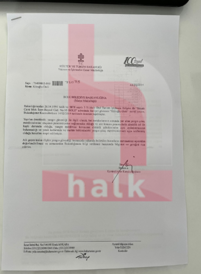 Otel faciasına, sorumluluğun Bolu Belediyesi'ne yıkılması için bilirkişi heyetine yapılan baskı gündemi sarsarken, otele ilişkin yakın zaman önce imza altına alınan bir dizi evrak, durumu çok net bir biçimde ortaya koydu.Belgelere göre 2022'de otelin 4 yıldızlı olma talebine bakanlık kontrolünce denetimler yapıldığı ve tesisin müşteri odalarında yangının anında tahliyeyi kolaylaştıracak kat planlarının bulunmadığı tespit edildiği ortaya çıktı. Bu konu ile ilgili Yatırım İşletmeler Genel Müdürlüğü ve İtfaiye Müdürlüğü'nün yazmış olduğu tutanaklar şu şekilde: