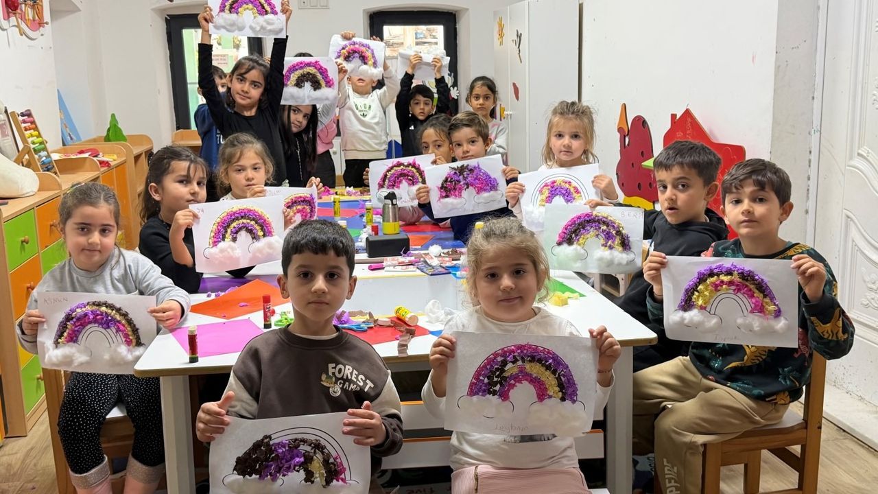 Kadın ve Aile Hizmetleri Müdürlüğü'nde görevli eğitmen Büşra Yabacı tarafından yürütülen atölyede çocuklar, renkli krapon kâğıtlarından gökkuşağı, pamuktan ise bulutlar yaparak yaratıcılıklarını ortaya koydu.