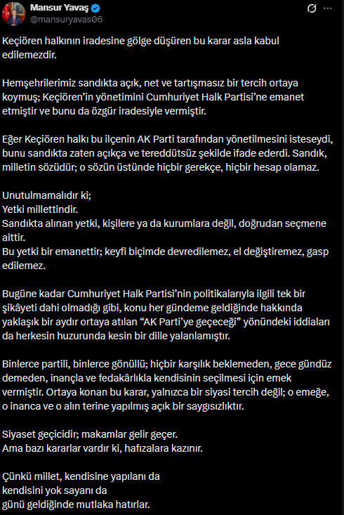 Eğer Keçiören halkı bu ilçenin AK Parti tarafından yönetilmesini isteseydi, bunu sandıkta zaten açıkça ve tereddütsüz şekilde ifade ederdi. Sandık, milletin sözüdür; o sözün üstünde hiçbir gerekçe, hiçbir hesap olamaz.