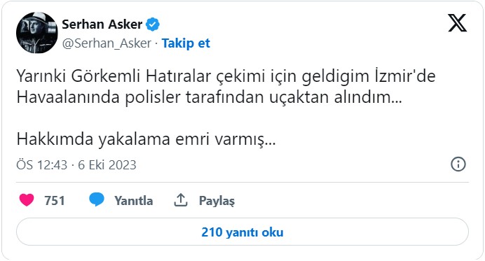 Serhan Asker sosyal medya hesabından yaptığı açıklamada, "Yarınki Görkemli Hatıralar çekimi için geldiğim İzmir'de Havaalanında polisler tarafından uçaktan alındım... Hakkımda yakalama emri varmış..." dedi.Halktv.com.tr'de yayınlanan bir haber üzerine adına soruşturma başlatıldığı öğrenilen Serhan Asker, ifadesi alındıktan sonra serbest bırakıldı.
