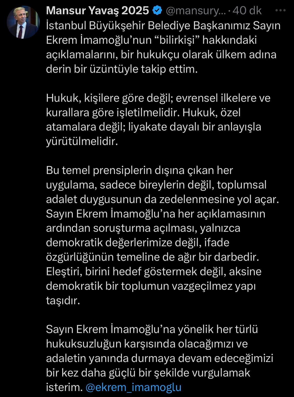 Son olarak, Ankara Büyükşehir Belediye (ABB) Başkanı Mansur Yavaş'tan, İmamoğlu'na destek mesajı geldi. Yavaş, X'ten paylaştığı mesajda, "Sayın Ekrem İmamoğlu’na yönelik her türlü hukuksuzluğun karşısında olacağımızı ve adaletin yanında durmaya devam edeceğimizi bir kez daha güçlü bir şekilde vurgulamak isterim" dedi. Yavaş, şu ifadeleri kullandı: