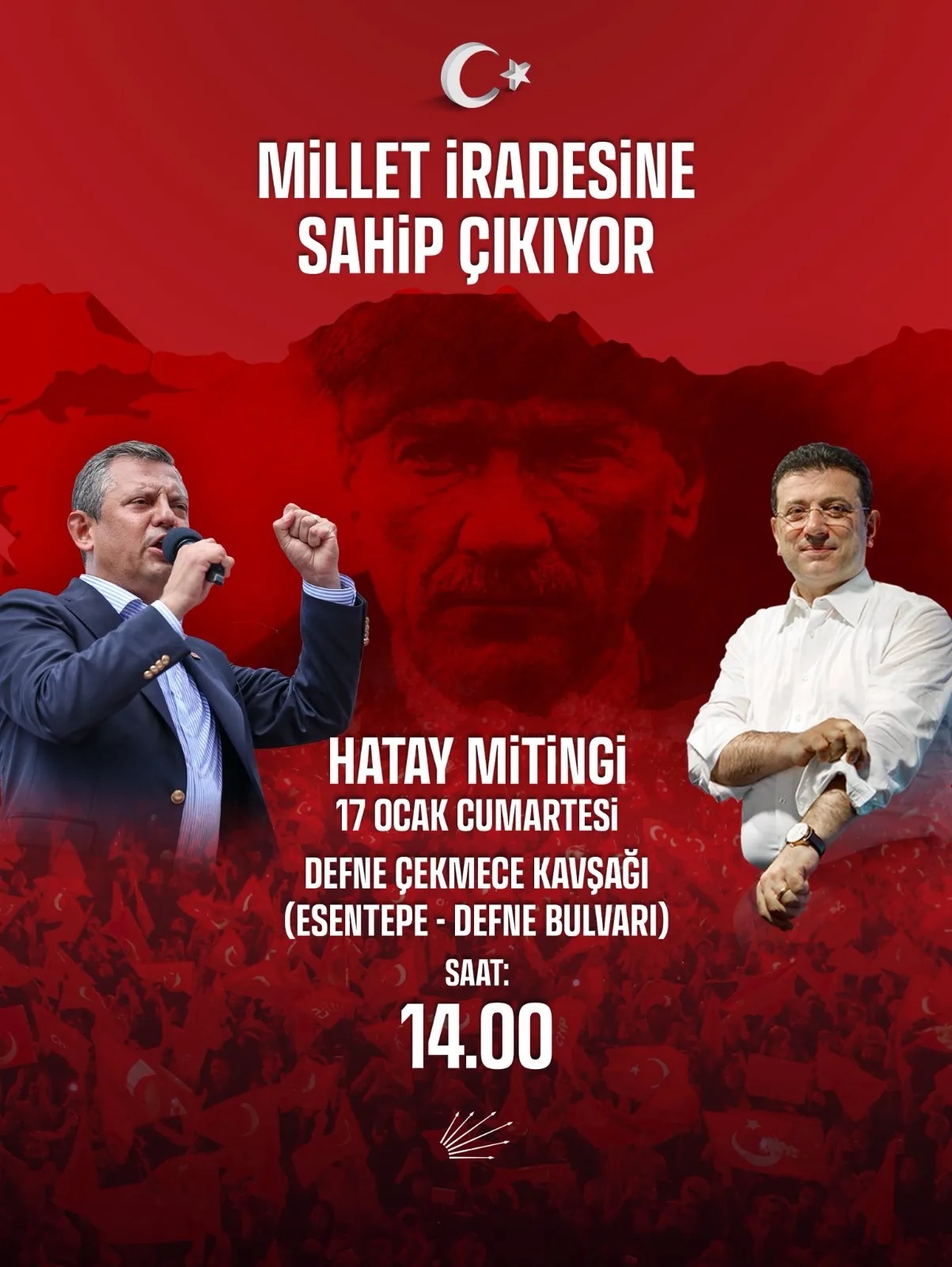 CHP'nin Mart 2025'te 'İmamoğlu'na özgürlük ve erken seçim' talebiyle başlattığı 'Millet İradesine Sahip Çıkıyor' mitinglerinin 82'ncisi 17 Ocak Cumartesi günü Hatay'da düzenlenecek.