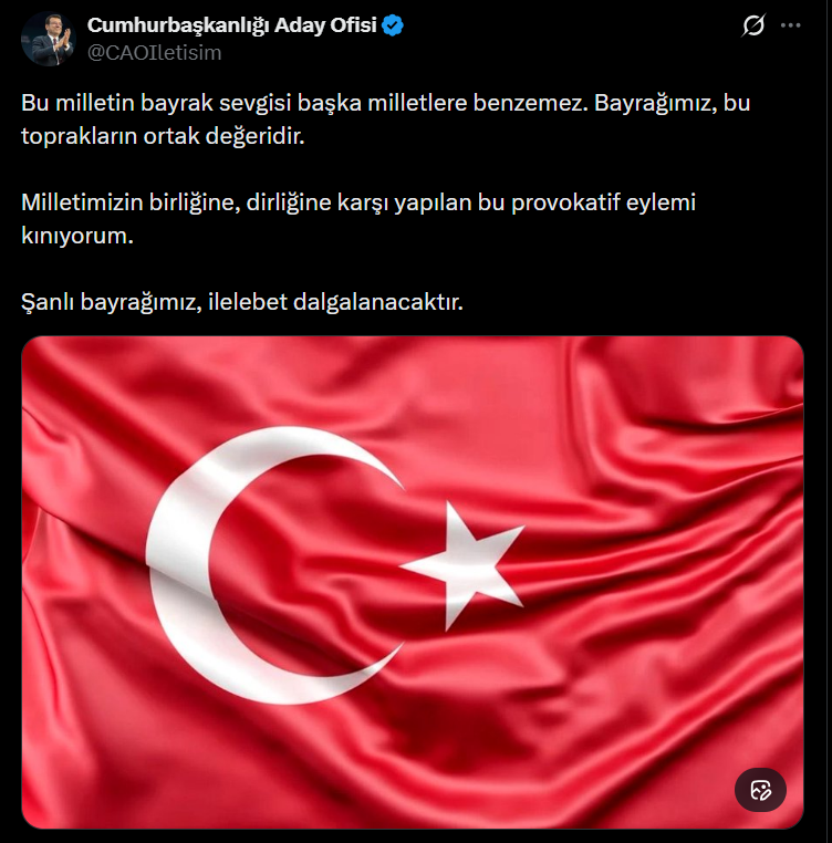 CHP'nin tutuklu cumhurbaşkanı adayı ve seçilmiş İBB Başkanı Ekrem İmamoğlu, Mardin Nusaybin'de yaşanan Türk bayrağı provokasyonuna tepki gösterdi.