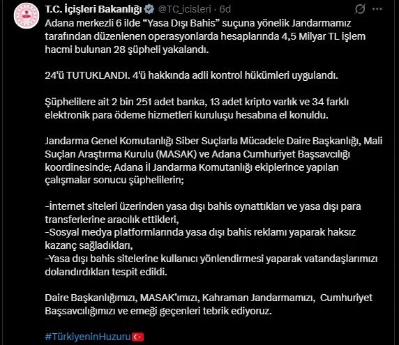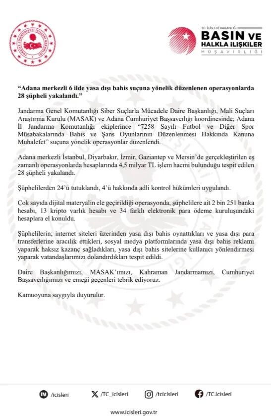İçişleri Bakanlığı, Adana merkezli olmak üzere İzmir dahil 6 ilde yasa dışı bahis suçuna yönelik gerçekleştirilen operasyonlarda 28 şüphelinin yakalandığını ve 24'ünün tutuklandığını açıkladı. Operasyonlarda şüphelilere ait hesaplarda toplam 4,5 milyar TL'lik işlem hacmi belirlendi.