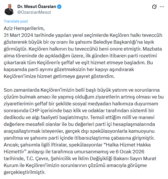 'Ayrıca belirtmek isterim ki; beraber yol yürüdüğüm başta Sayın Mansur Yavaş olmak üzere Ankaralı diğer Belediye Başkanlarına teşekkür etmem sebebi ile CHP içerisinde yer alan ve bu sürecin buraya gelmesine sebep olan kliklerin 'teşekkür' etmemi de başka yerlere çekeceğini de düşünerek belediye başkanı arkadaşlarımdan helallik istiyorum.' ifadelerini kullanan Özarslan, 'Keçiörenli hemşerilerimin emanetini layıkıyla taşımaya ve parti ayrımı gözetmeksizin ilçemiz için çalışmaya kararlılıkla devam edeceğim.' dedi.