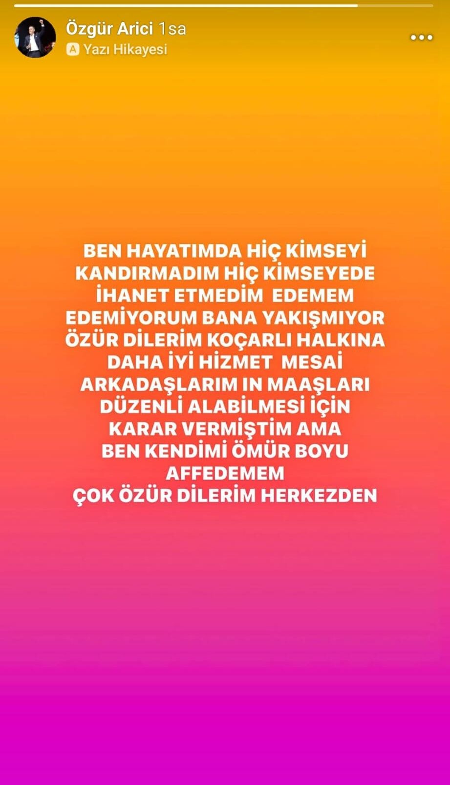 CHP'de kalma kararı alan Arıcı, 'Ben hayatımda hiç kimseyi kandırmadım. Hiç kimseye de ihanet etmedim, edemem, edemiyorum. Bana yakışmıyor. Özür dilerim. Koçarlı halkına daha iyi hizmet, mesai arkadaşlarımın maaşları düzenli alabilmesi için karar vermiştim ama ben kendimi ömür boyu affedemem. Çok özür dilerim herkesten' dedi.