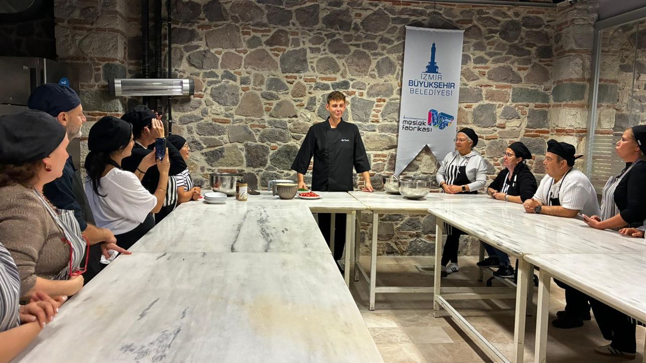 İzmir Büyükşehir Belediyesi'nin Meslek Fabrikası'nda düzenlediği sağır ve işitme engelli kursiyerlere yönelik pastacı çıraklığı kursundan mezun olan kursiyerler, İzmir Çeşme'de restoranı bulunan ve sosyal medya platformlarında birbirinden özel tariflerini paylaşan şef Rıfat Yurttaş ile buluştu. Engelli Çalışmaları Şube Müdürlüğü'nde görevli işaret dili çevirmenleri Özlem Özer ve Melek Uslular'ın çevirmenliğiyle katılımcılarla iletişim kuran Yurttaş, onlarla birlikte Ege mutfağına ait meze ve zeytinyağlı yemekler yaptı.