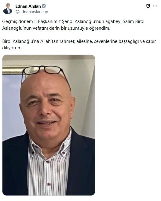 Ednan Arslan ise taziye mesajında, 'Geçmiş dönem İl Başkanımız Şenol Aslanoğlu'nun ağabeyi Salim Birol Aslanoğlu'nun vefatını derin bir üzüntüyle öğrendim. Birol Aslanoğlu'na Allah'tan rahmet; ailesine, sevenlerine başsağlığı ve sabır diliyorum.' dedi.