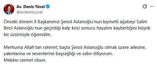 Deniz Yücel de sosyal medya hesabından yaptığı paylaşımda, 'Önceki dönem İl Başkanımız Şenol Aslanoğlu'nun kıymetli ağabeyi Salim Birol Aslanoğlu'nun geçirdiği kalp krizi sonucu hayatını kaybettiğini büyük bir üzüntüyle öğrendim. Merhuma Allah'tan rahmet; başta Şenol Aslanoğlu olmak üzere ailesine, yakınlarına ve sevenlerine başsağlığı ve sabır diliyorum. Mekânı cennet olsun.' ifadelerine yer verdi.