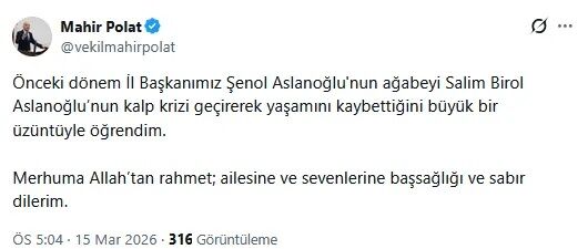 Mahir Polat sosyal medya hesabından yaptığı paylaşımda, 'Önceki dönem İl Başkanımız Şenol Aslanoğlu'nun ağabeyi Salim Birol Aslanoğlu'nun kalp krizi geçirerek yaşamını kaybettiğini büyük bir üzüntüyle öğrendim. Merhuma Allah'tan rahmet; ailesine ve sevenlerine başsağlığı ve sabır dilerim.' ifadelerini kullandı.