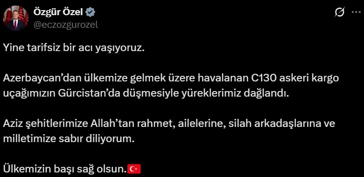 CHP Genel Başkanı Özgür Özel, üzücü olay için sosyal medya hesabından taziye mesajı yayınladı.
