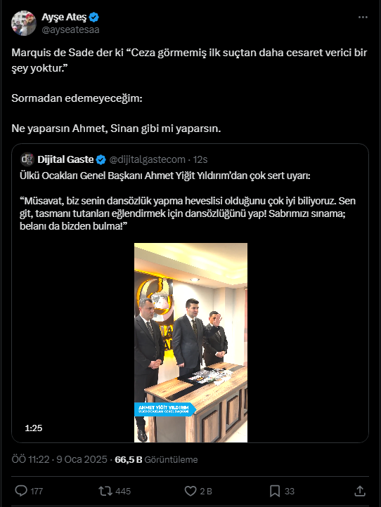 Yıldırım'ın tehditkar açıklamaları üzerine, eski Ülkü Ocakları Başkanı Sinan Ateş'in eşi Ayşe Ateş, sosyal medya üzerinden bir paylaşım yaptı.